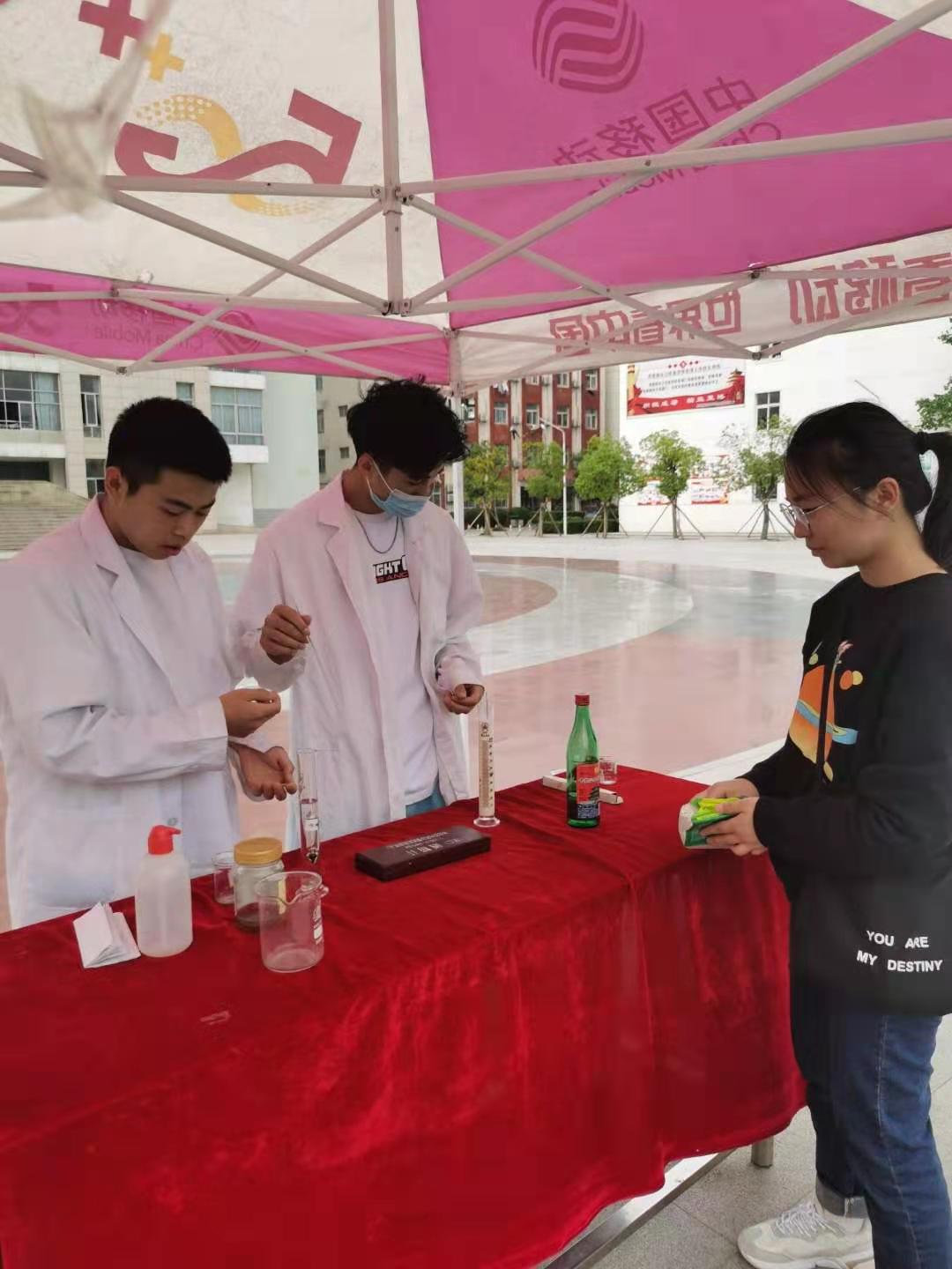 员工利用所学知识和技能现场为广大师生演示常见食品相关指标的快速检测方法。