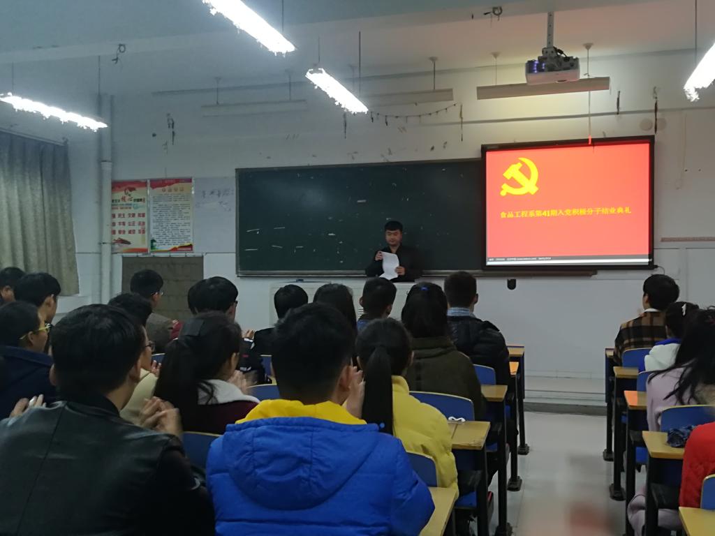 11月17日中共tyc522cc太阳成集团食品工程系党总支在3号楼404教室隆重举行了tyc522cc太阳成集团食品工程系第41期入党积极分子结业典礼,食品工程系党总支书记叶桂娥、员工党支部书记王文甫、员工党支部纪检委员韩磊出席本次典礼。