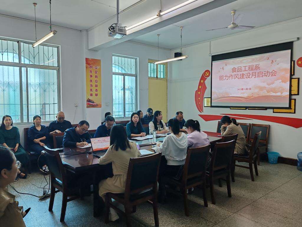为学习贯彻习近平新时代中国特色社会主义思想主题教育,提升全体教职工担当作为能力,切实做到“学思想,强党性,重实践,立新功“,以学促干,真抓实干。11月1日下午,食品工程系召开了能力作风建设月启动会,会议由食品工程系党总支负责人王新娜主持,全体教职工参加了会议。