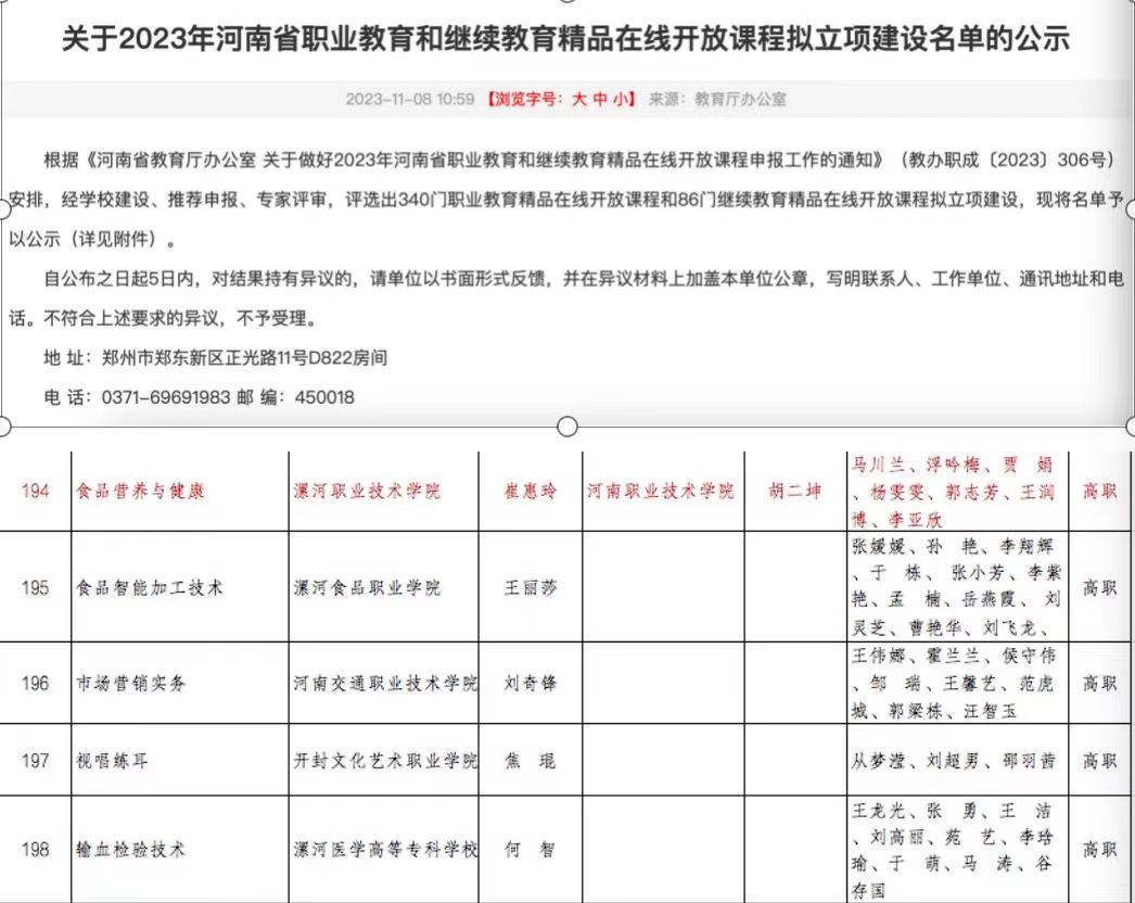 11月8日,河南省教育厅公布了《关于2023年河南省职业教育和继续教育精品在线开放课程拟立项建设名单的公示》,食品工程系崔惠玲教授主持的课程《食品营养与健康》成功入选为省级职业教育在线精品课程立项项目。